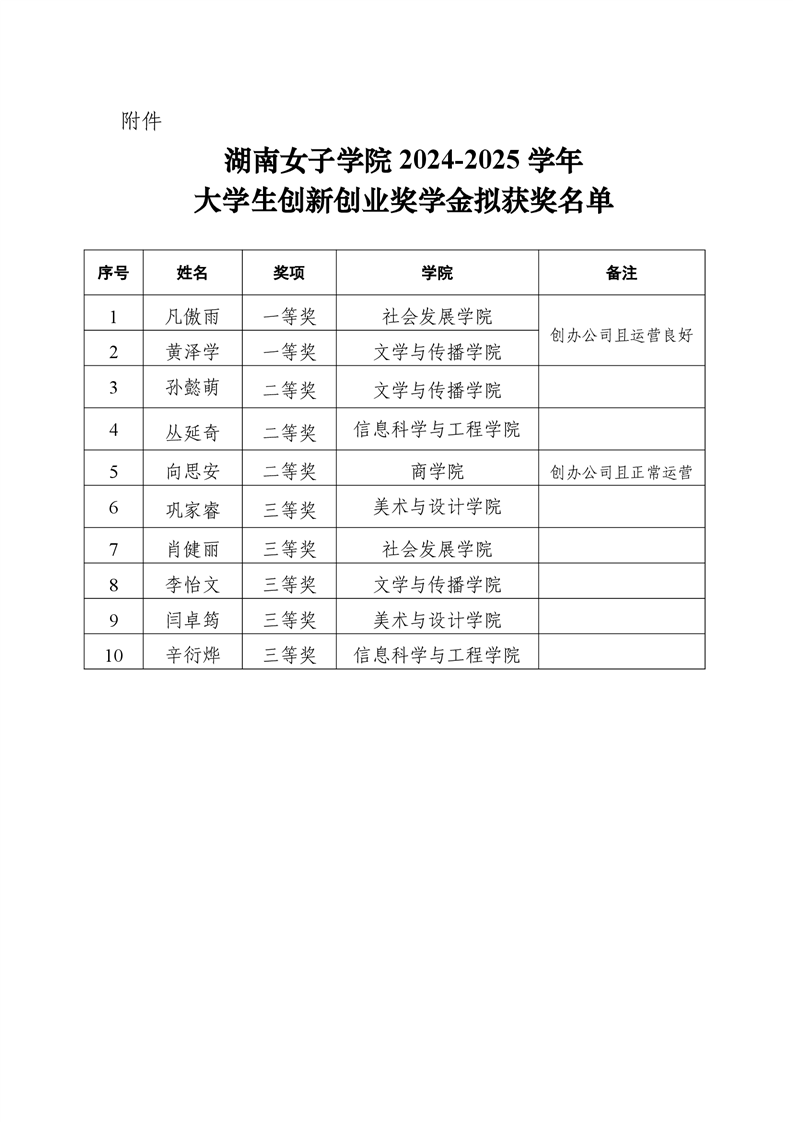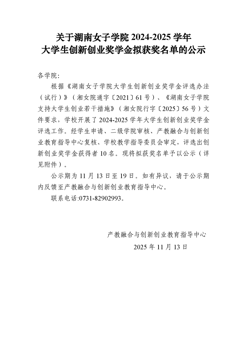 关于湖南女子学院2024-2025学年大学生创新创业奖学金拟获奖名单的公示