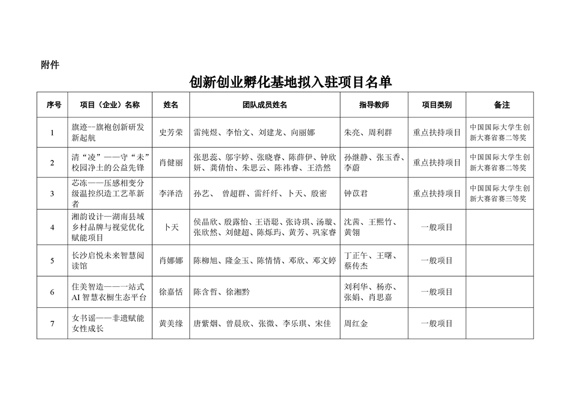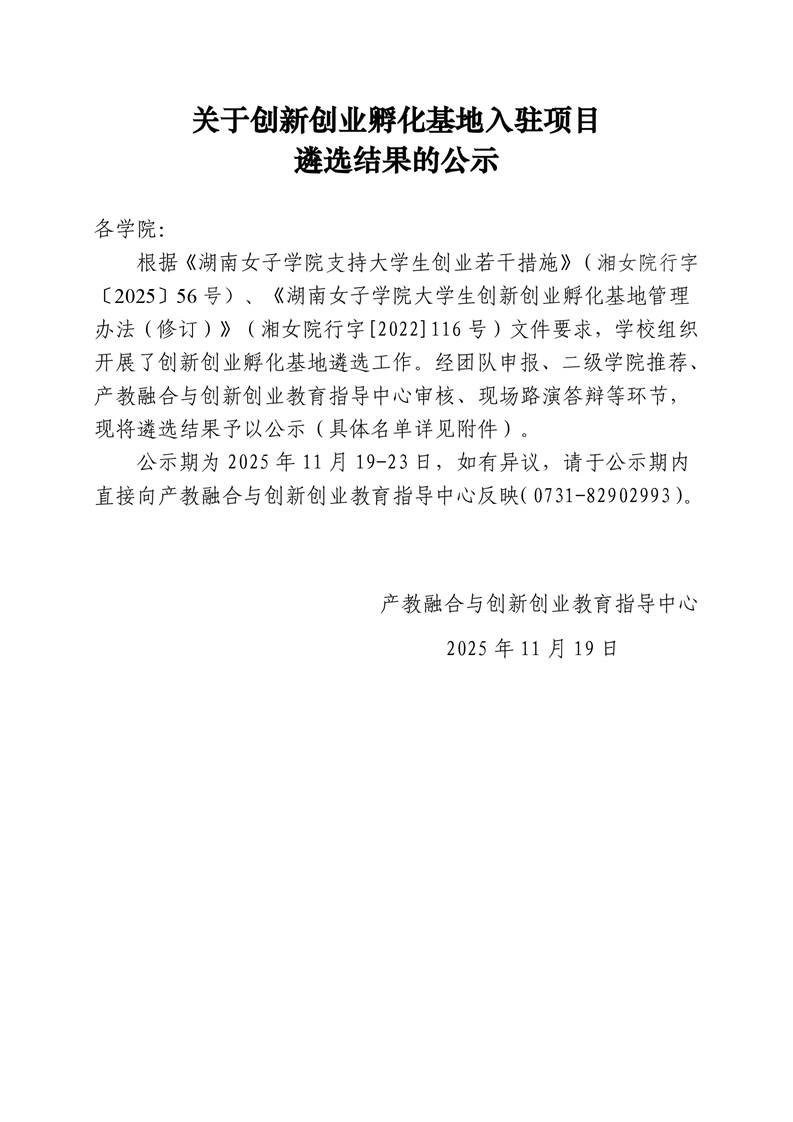 关于创新创业孵化基地入驻项目遴选结果的公示