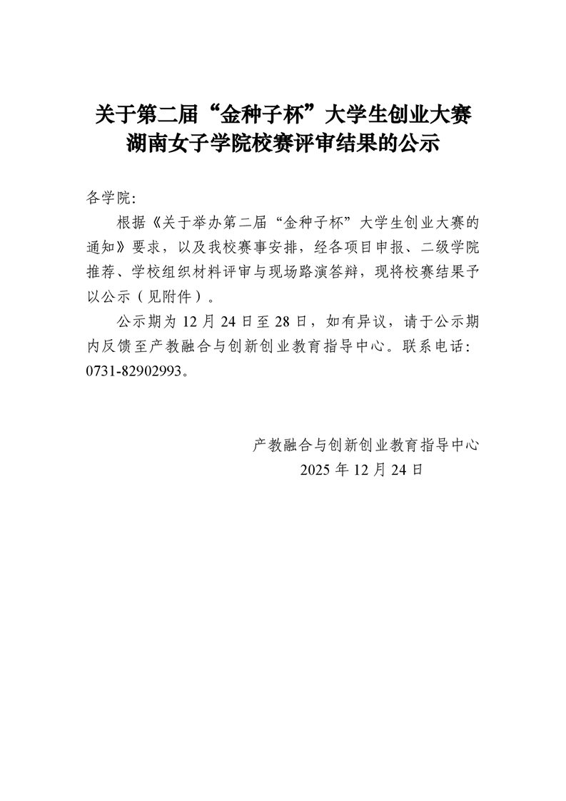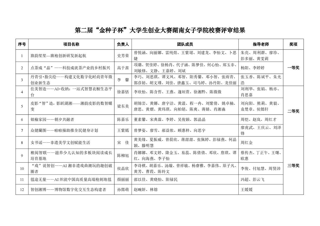 关于第二届“金种子杯”大学生创业大赛湖南女子学院校赛评审结果的公示